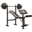 Een halterbank waarbij 45 kilo aan gewichten wordt meegeleverd.