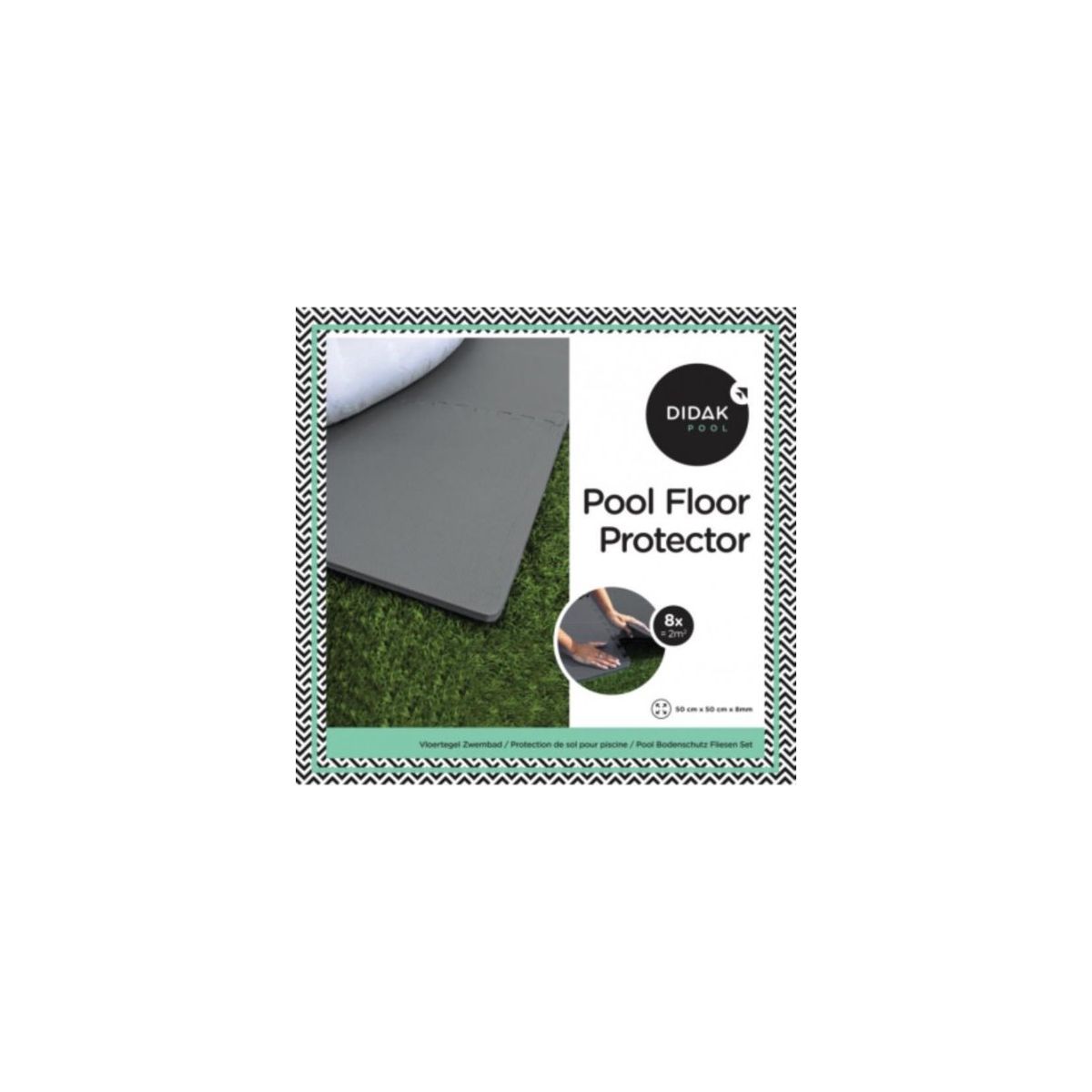 Didak Pool pool floor protector, grijs reli�f. Bescherm de onderkant van je zwembad of spa met behulp van deze vloertegels. Doordat de tegels als puzzelstukken in elkaar passen, kan je de oppervlakte van de vloertegels aanpassen naar de grootte die je nodig hebt. Deze set bevat 4 tegels, waarmee je een oppervlakte van 1 m2 kan bedekken. Dikte van de vloertegels: 15 mm Afmetingen: 50x50 cm