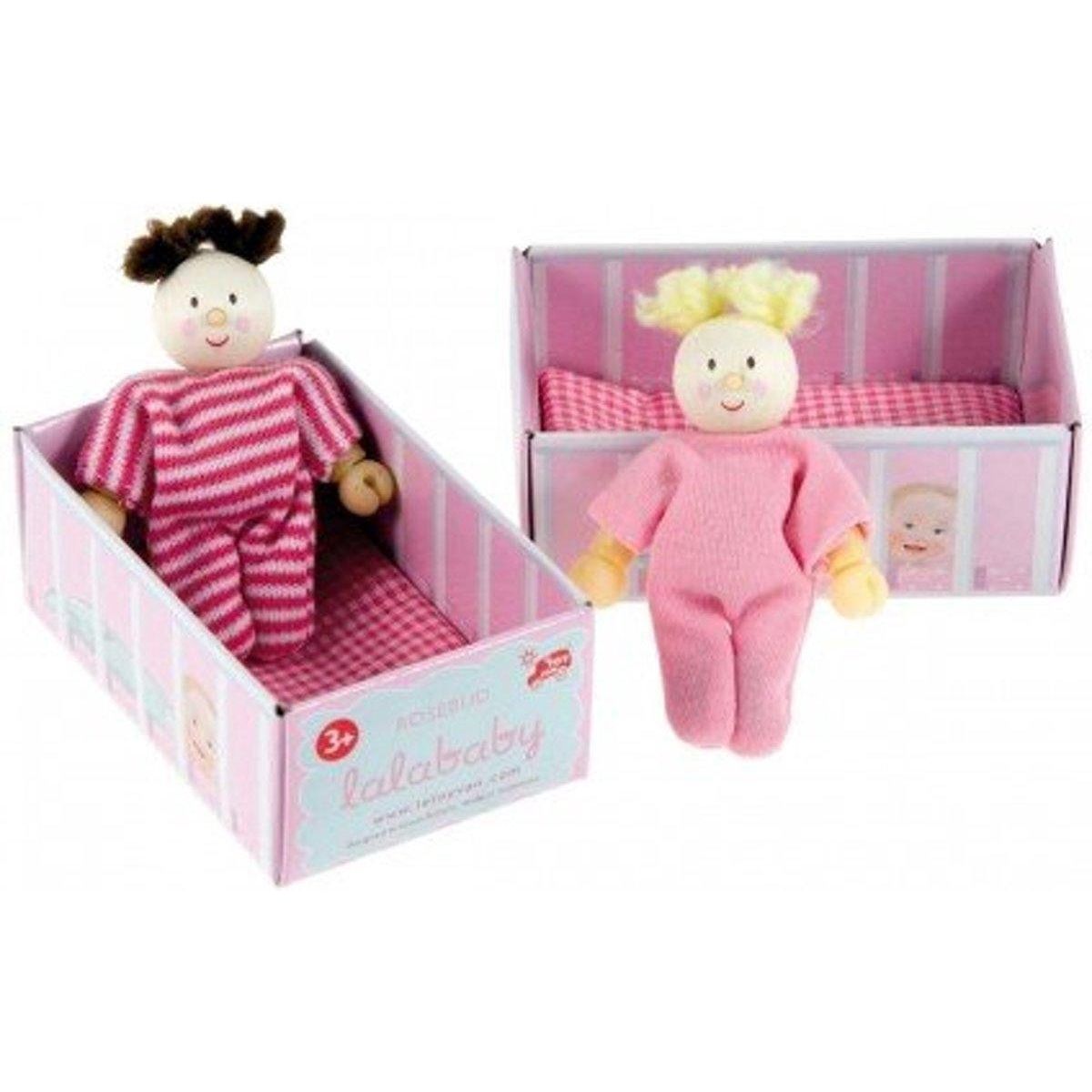 Lalababy ligt op een dun matrasje in een mooi doosje. Er is een Lalababy jongen in een gestreept roze pyjama en een meisje in een roze pyjama.