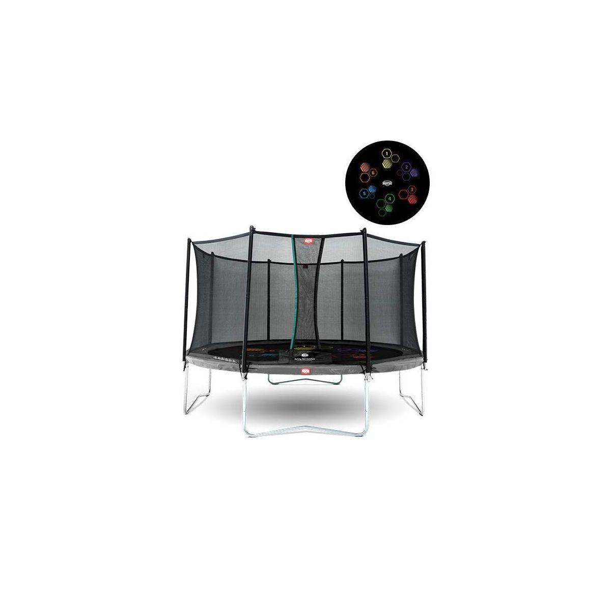 This Berg Favorit 430 Grey Levels Trampoline + Safety Net Comfort beschikt about een Jump Mat dat bedrukt is with een spel dat ontwikkeld werd through Berg Toys and the basisonderwijs.
